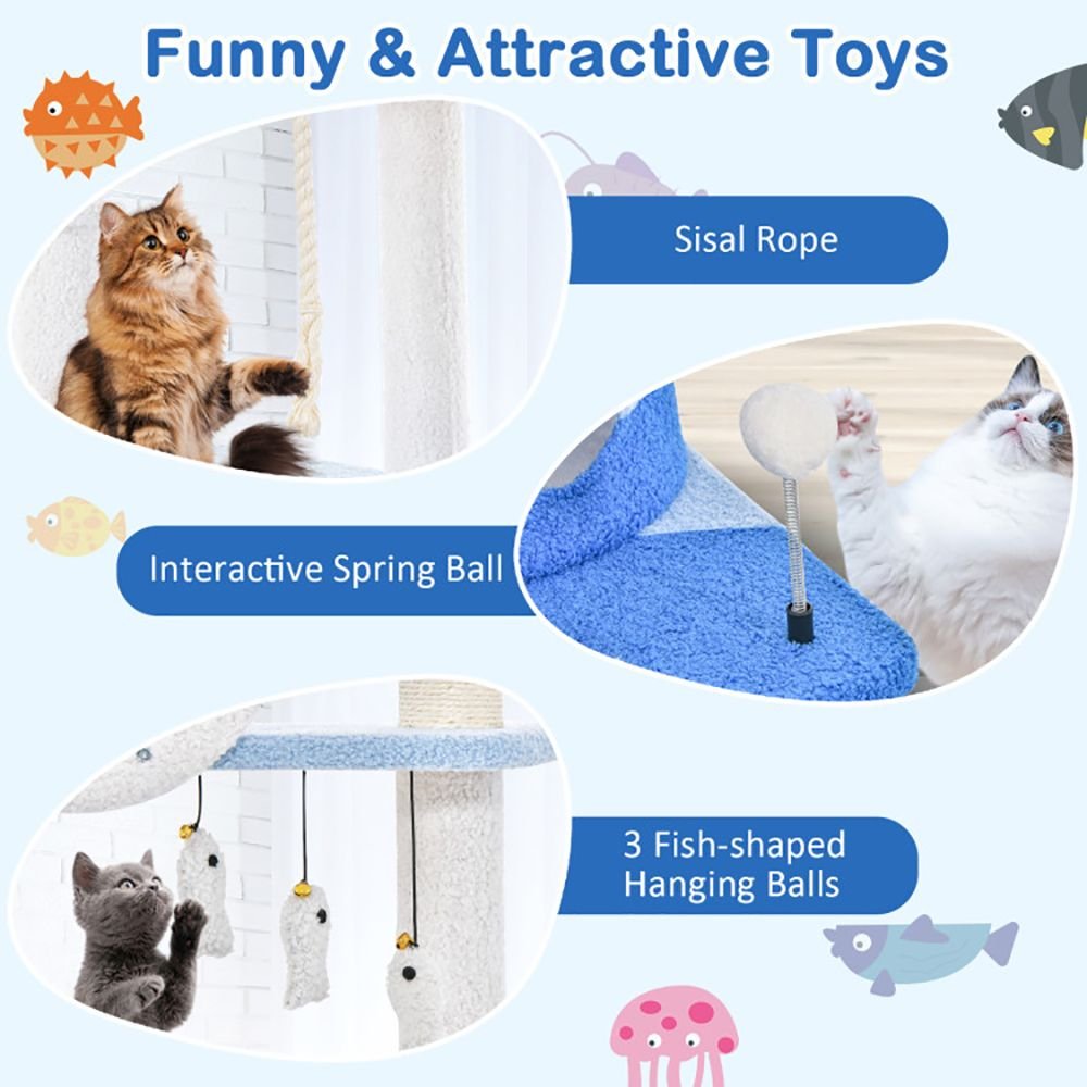3.Versatile Play Center: The ocean-themed cat tree is designed with a variety of interactive toys, from the alluring sisal rope for them to scratch and fish-shaped balls that ignite their hunting instincts. And the spring ball will provide extra entertainment.