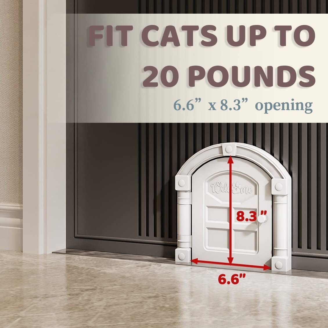 5.Comes completely finished in a beautiful semi gloss White, or you can easily paint it yourself, to match your homes decor.Pass through opening is 6.6" wide and 8" height and can be used by all cats up to 20 lbs.