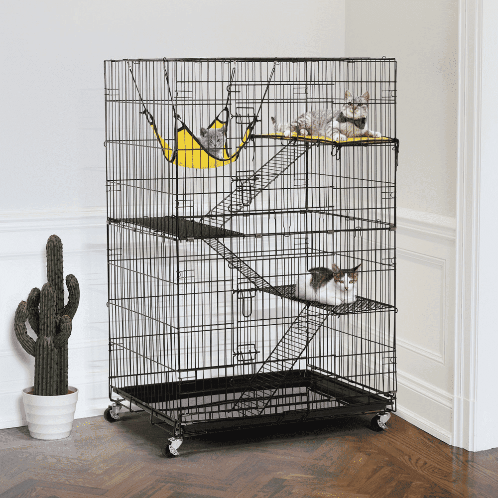 This 4-tier cat cage has a well-built structure made of harmless finished iron. As a detail-oriented pet cage; it boasts a sturdy staircase; quality hammock/bedding; an easy-to-clean litter tray at the bottom; secured cage lock; and brake casters; which makes it an ideal choice of the rolling cage for pet parents. Also; the cage applies user-friendly construction and comes along with easy-to-read worry-free assembly instructions in the package.