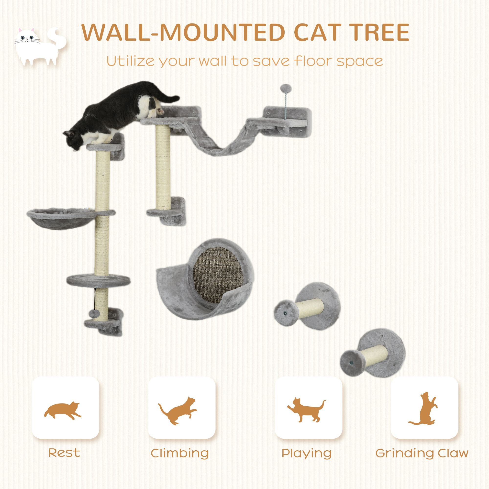 Elevate your cat's playtime with the PawHut Cat Shelf Set. This innovative cat furniture offers multi-level fun with platforms, a hanging bed, soft ladders, perch, and more. It's built for stability with a multilayer board structure that lets cats jump, run, and climb. Covered with soft plush fabric, it creates a comfortable resting spot that's excellent for cat naps. More than entertainment for your cat, it's an impressive addition to your home.
