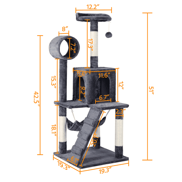 The 51" multiple-level cat tree is constructed of harmless particle board, skin-friendly plush, and natural sisal rope, providing your pets a safe and comfy playing and napping space. Multiple scratching posts help develop positive scratching habits and more importantly, free your furniture from those sharp little claws. Warm and fluffy condos and hammocks provide the best lounging spots for your little adventurers after finishing their exploration on the tunnel and ladder. This solid and sturdy cat tower is perfect for 1-2 kittens/small cats to have fun and rest at the same time.