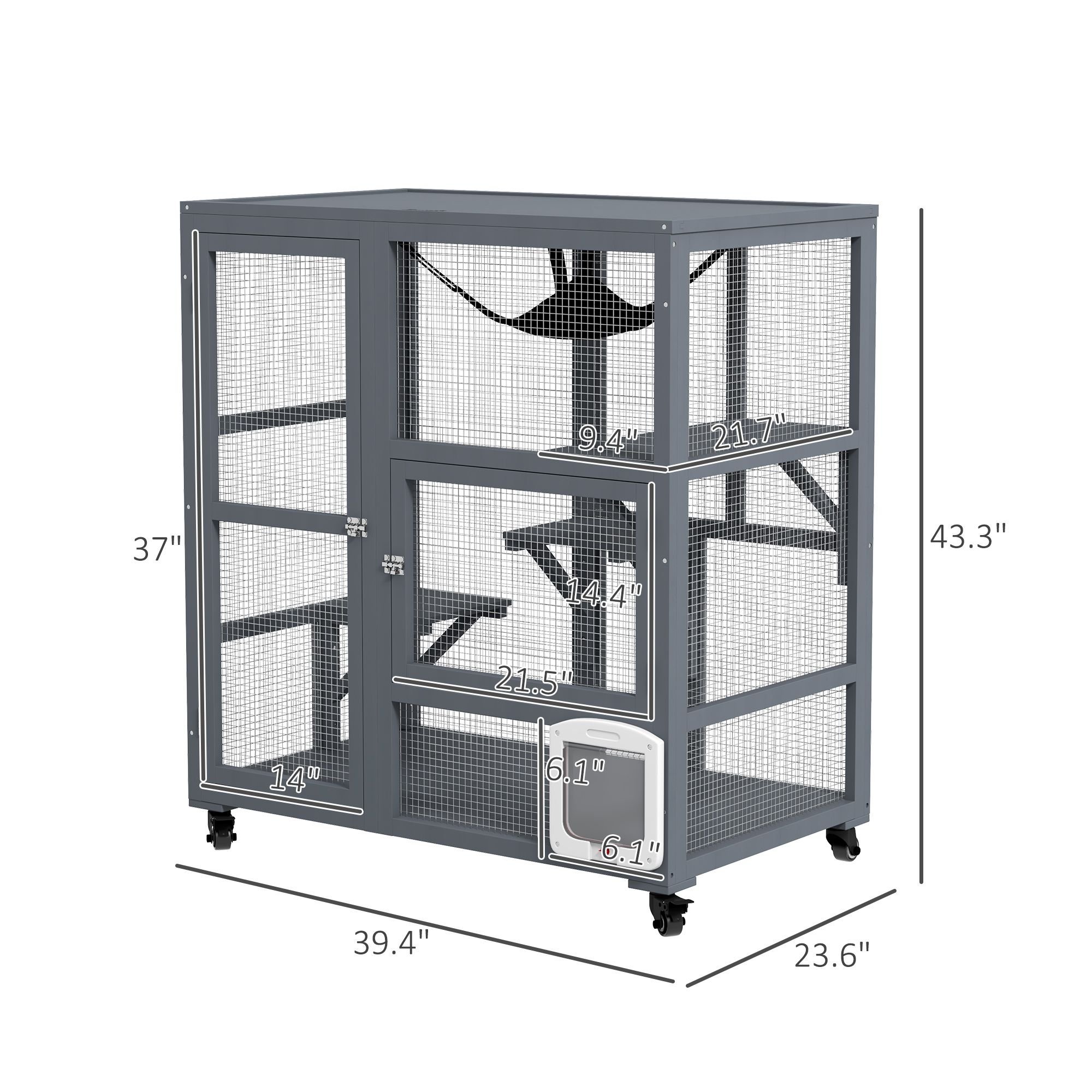 • - Door Size: Front: 14" W x 37" H. Middle: 21.5" W x 14.25" H. Flap door: 6" W x 6" H