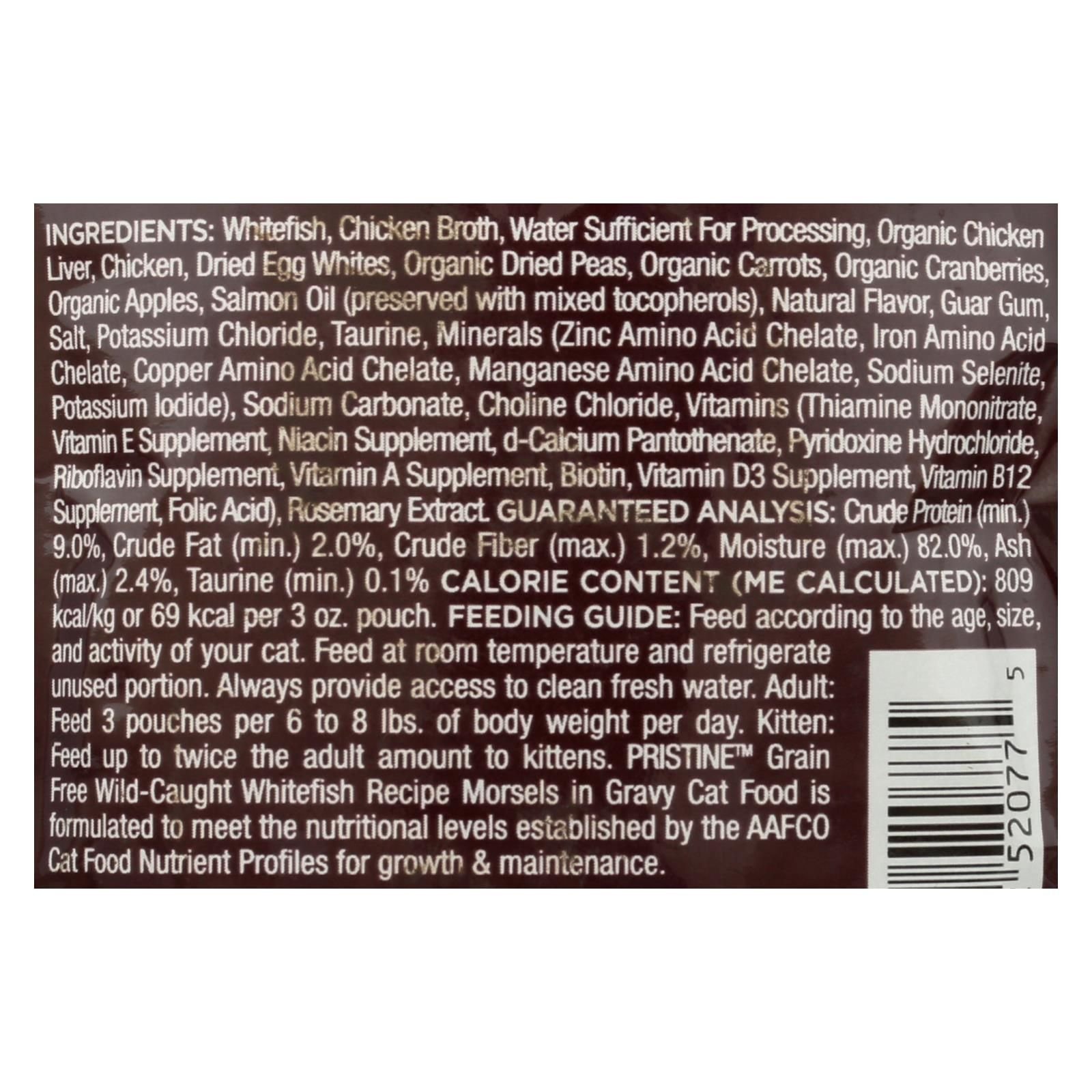 Castor & pollux wet cat food, pristine grain-free wild-caught whitefish recipe is a healthy and delicious wet food for your feline friends. Made primarily with natural ingredients and fortified with vitamins, pristine grain-free wild-caught whitefish recipe is largely free of unnatural and unnecessary additives. This product is organic and does not contain any grain. Each pouch of castor & pollux wet cat food, pristine grain-free wild-caught whitefish recipe weighs 3 oz. See nutrition facts panel for allergens.