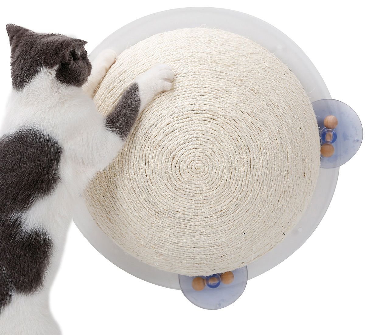 The Pet Life ® 'Stick N' Claw' Sisal Rope and Toy Suction Cup Circular Cat Scratcher is a unique Cat Scratcher that suctions to hard surfaces and glass in a matter of seconds with a built-in pinch-to-release flap for easy removal. The Stick N' Claw rounded scratcher features three large industrial-grade suction grips that can be stuck to walls with included optional Drywall screws for more permanent placement. Composed of Heavy-Duty Sisal Rope that's extremely durable and built-to-last. Makes a great floor space-saver when hung or suctioned to walls. A great alternative to bulkier or larger cat scratching posts and great for travel.