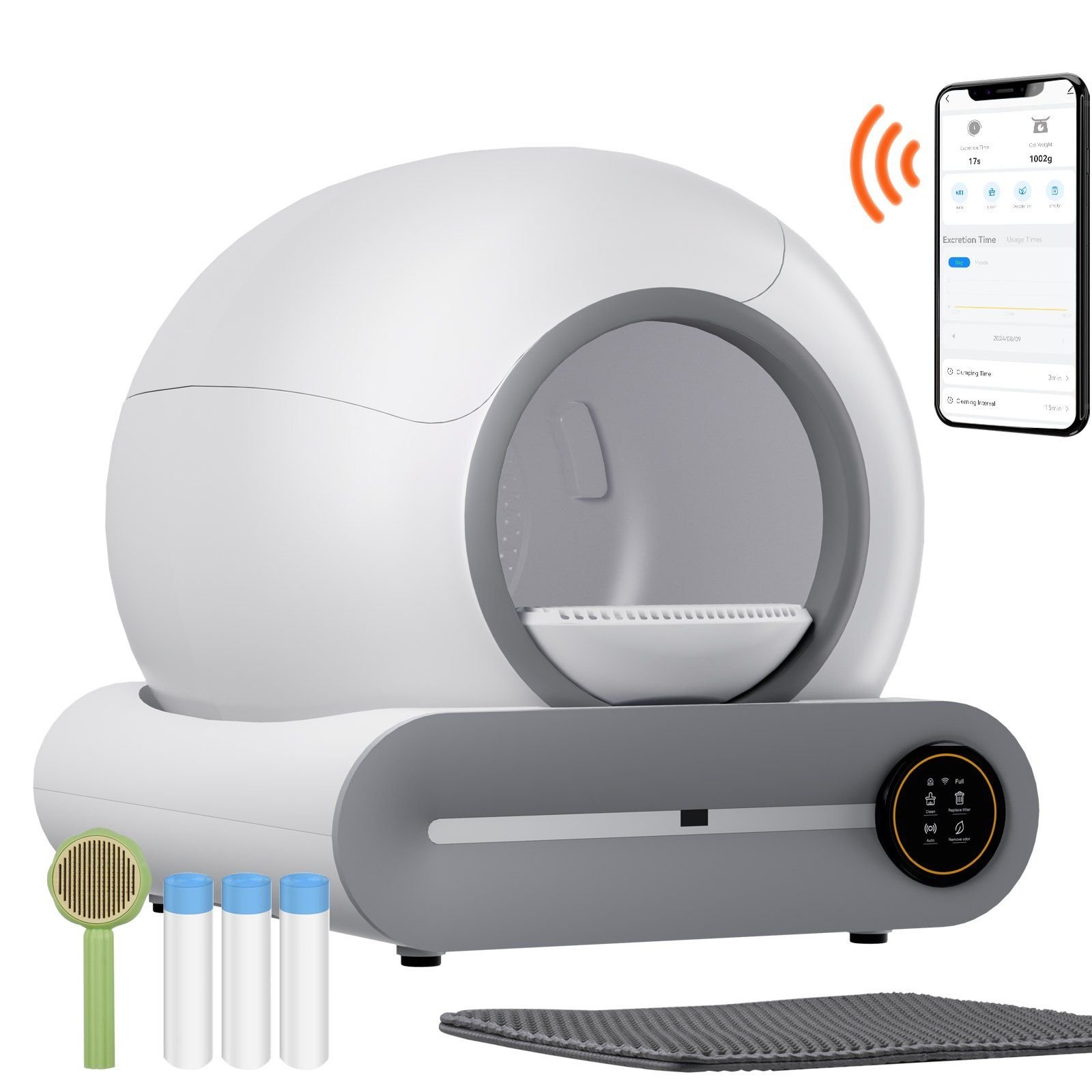 5.What's in the Package: 1 smart cat litter box with integrated body, 3 rolls of trash bags, 1 litter mat, 1 pet brush, 1 entry mat, and 1 instruction manual.
