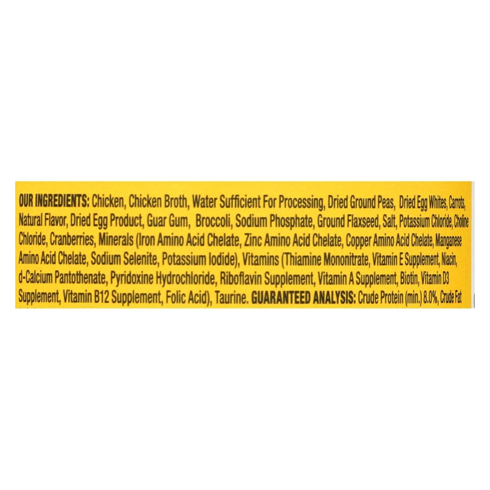 ingredients : chicken;chicken broth;water sufficient for processing;dried ground peas;dried egg whites;tomatoes;carrots;natural flavor;dried egg product;guar gum;sodium phosphate;ground flaxseed;salt;potassium chloride;choline chloride;cranberries;minerals;iron amino acid chelate;zinc amino acid chelate;copper amino acid chelate;manganese amino acid chelate;sodium selenite;potassium iodide;vitamins;thiamine mononitrate;vitamin e supplement;niacin;d-calcium pantothenate;pyridoxine hydrochloride;riboflavin supp