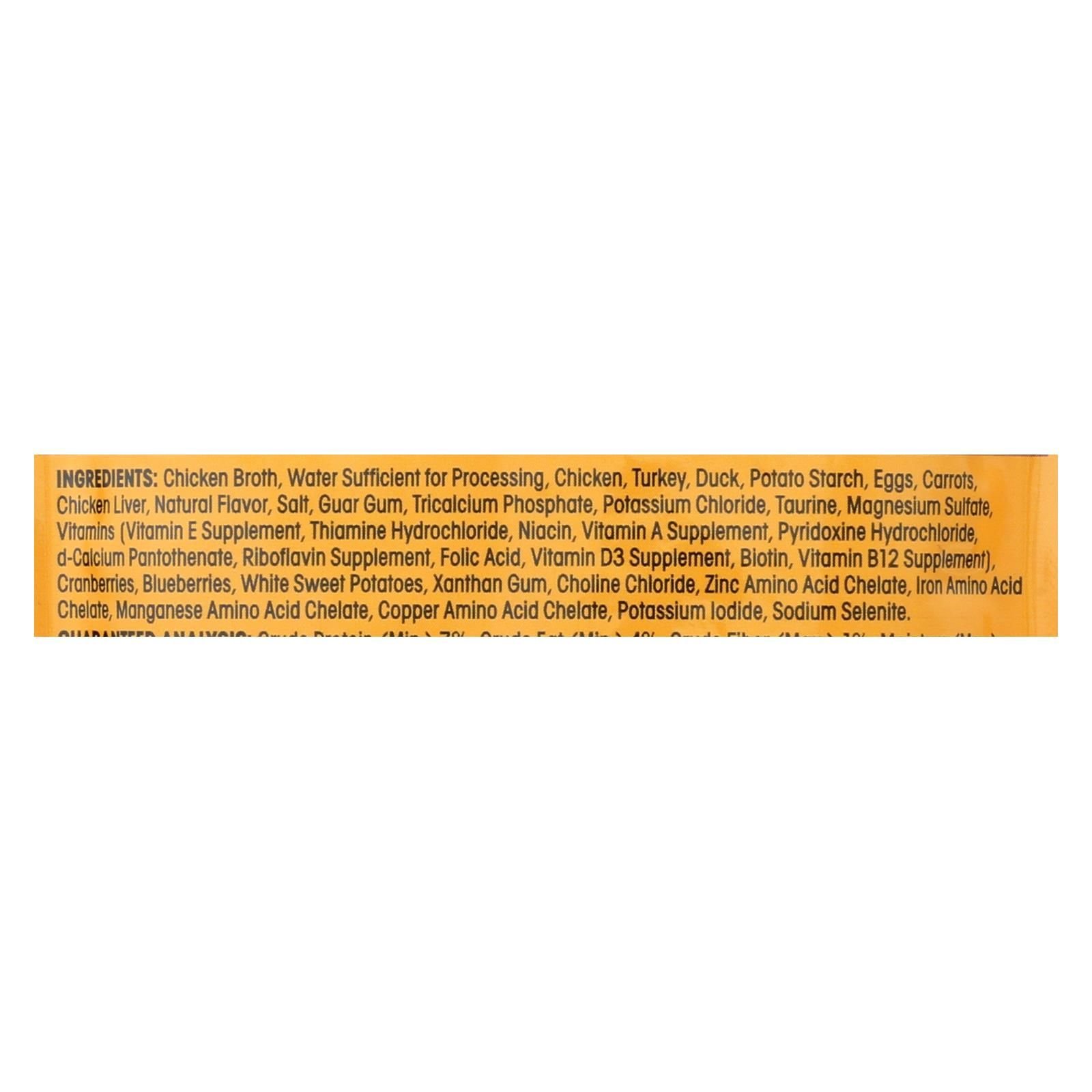 ingredients : chicken broth;water sufficient for processing;chicken;turkey;duck;potato starch;eggs;carrots;chicken liver;natural flavor;salt;guar gum;tricalcium phosphate;potassium chloride;taurine;magnesium sulfate;vitamins;vitamin e supplement;thiamine hydrochloride;niacin;vitamin a supplement;pyridoxide hydrochloride;d-calcium pantothenate;riboflavin supplement;folic acid;vitamin d3 supplement;biotin;vitamin b12 supplement;cranberries;blueberries;white sweet potatoes;xanthan gum;choline chloride;zinc amino