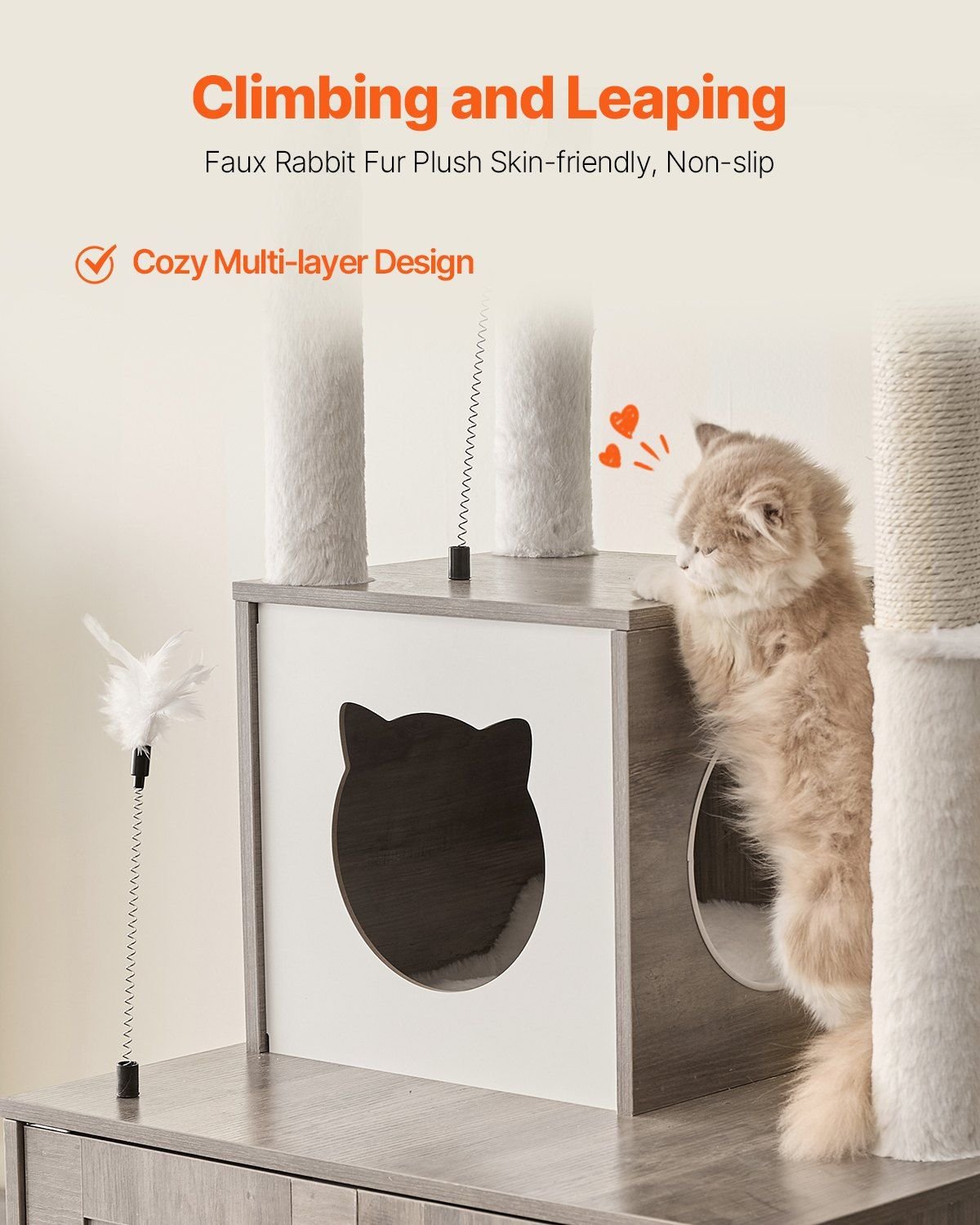 This multifunctional cat tree is ideal for both play and relaxation. With sisal posts for scratching, a comfy faux rabbit fur pad, and a built-in litter box enclosure, it keeps your cats entertained and your home smelling fresh.