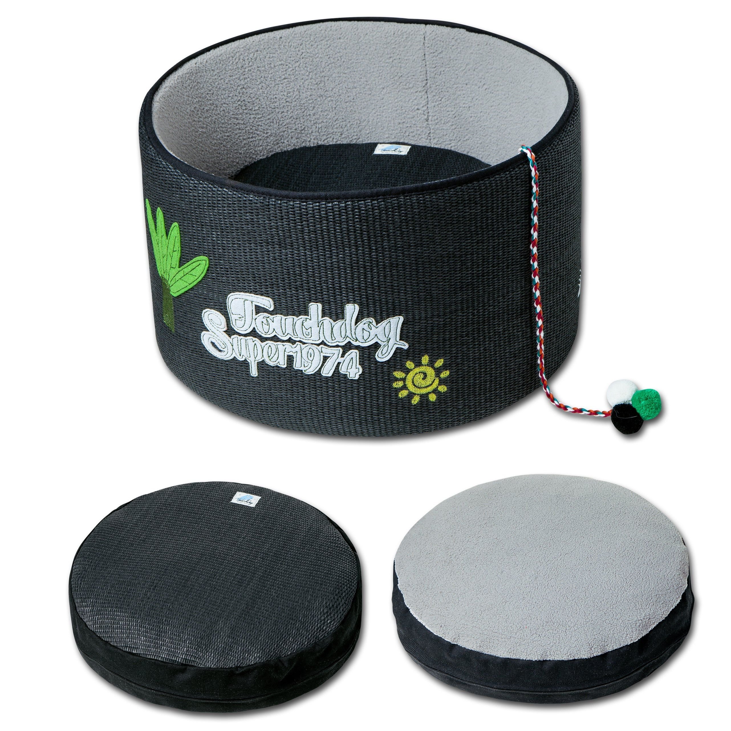 Touchcat 'Claw-ver Nest' Rounded Scratching Cat Bed w/ Built-in Teaser Toy is composed of a Extremely Durable Nylon blended Scratch-proof cylindrical exterior shell that is durable enough to withstand a cats paws from damaging the surface. This fabric is also used on the reverse side of the interior cushion that is further reversed with an ultra-soft sherpa-like cotton material. The inner walls are composed of comfortable Polar Fleece. The inner cushion is inner-lined with High-grade Polyfill for superior plush comfort when lounging. Features surround stitched embroidery and stitching and reinforced-tubed stitching for long-lasting durability. The included cushion zips open and enables the inner cushion to be placed directly into the wash. Features a Built-in Pom-pom teaser toy for interactive play. Available in Multiple Colors.