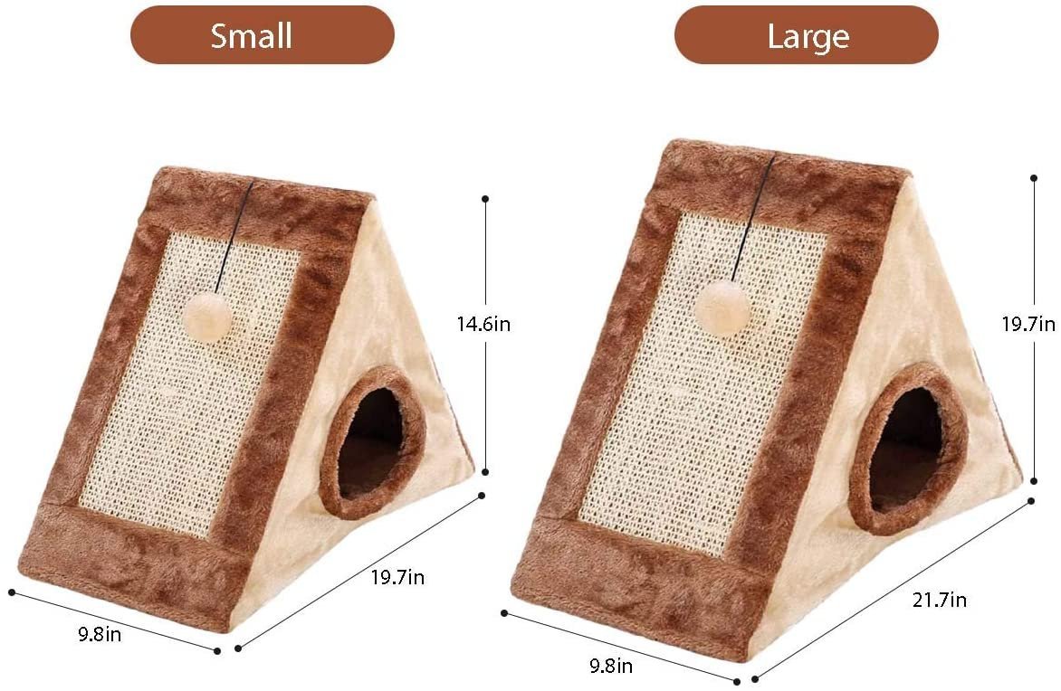 Design: The triangular design provides a safe, comfortable cocoon sanctuary that also features two scratching boards, adorned on both sides of the triangle hideaway bed, provide hours of fun and play time for your cats, and reduce furniture damage caused by scratches